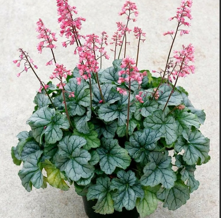 Соцветия этой гейхеры состоят из небольших метелок, а цветки имеют колокольчатую форму и розовый оттенок. Этот сорт отлично подходит для выращивания в бордюрах, вазонах и кашпо.