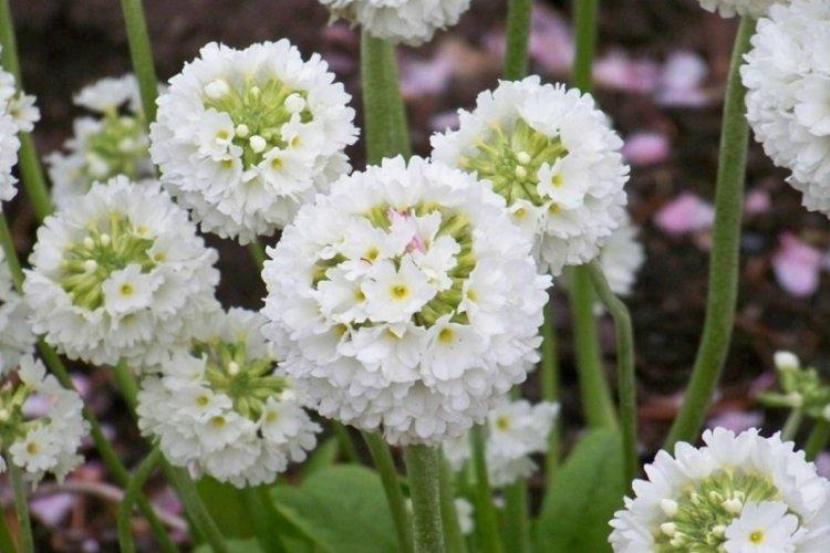 Примула Мелкозубчатая – это изысканный и декоративный садовый сорт, который привлекает внимание своими плотными соцветиями в форме помпонов. Диаметр соцветий может достигать 10 см, а цветовая палитра включает белые, красные, лиловые и фиолетовые оттенки. На фоне высоких и мощных цветоносов, овальные листья с текстурной поверхностью кажутся миниатюрными.
